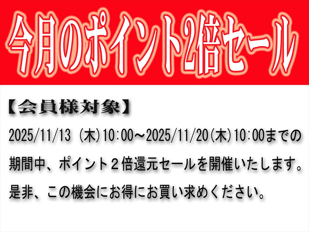 - 2025.11.02今月のポイント2倍還元セールのお知らせ